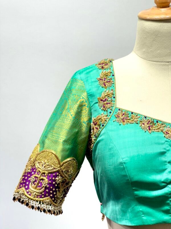 Zardosi and bead work floral design handwork blouse with danglers for sleeves, back neck & waist