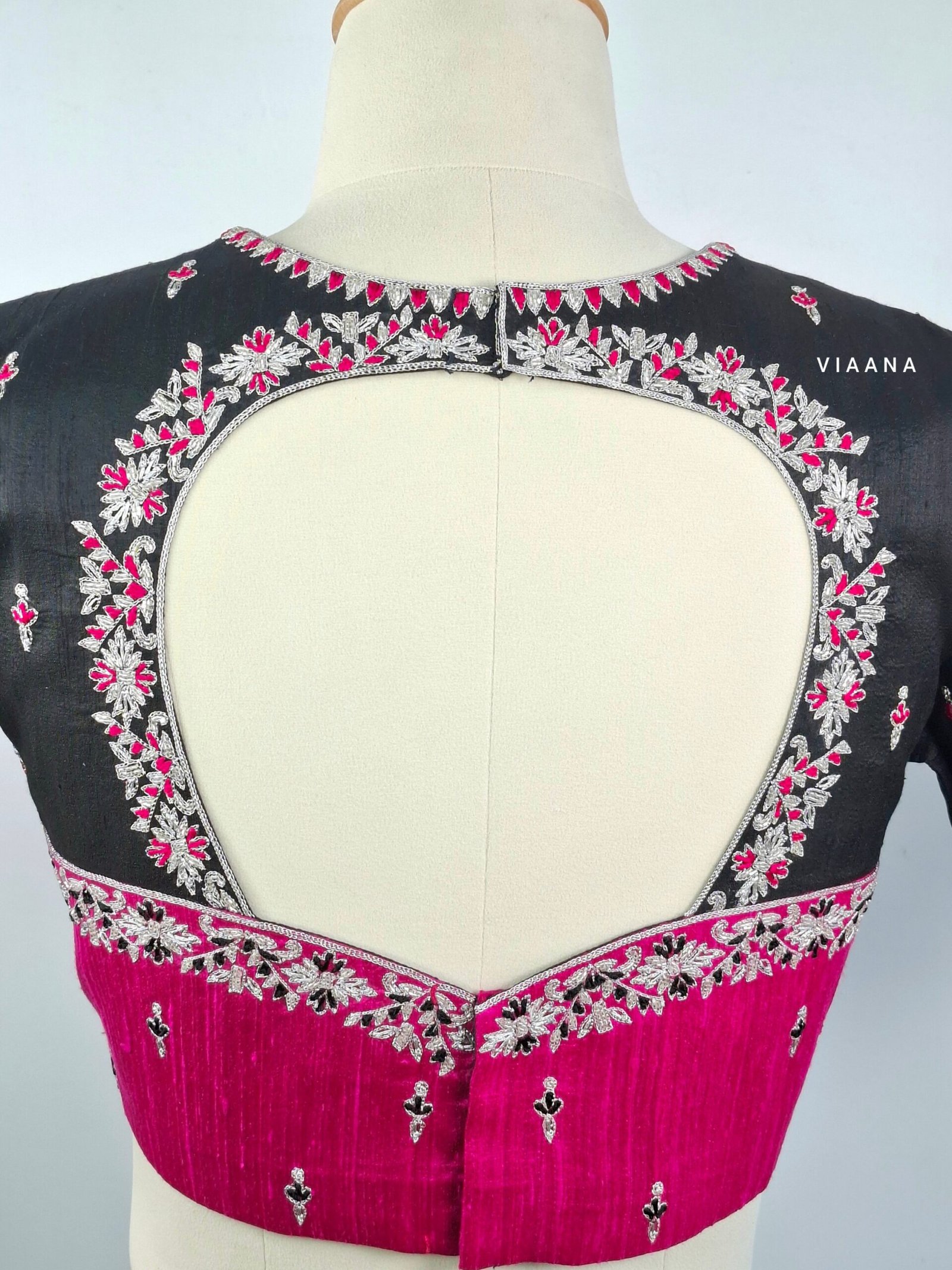 Black and pink blouse embroidery made with zari, cutdana and threadwork