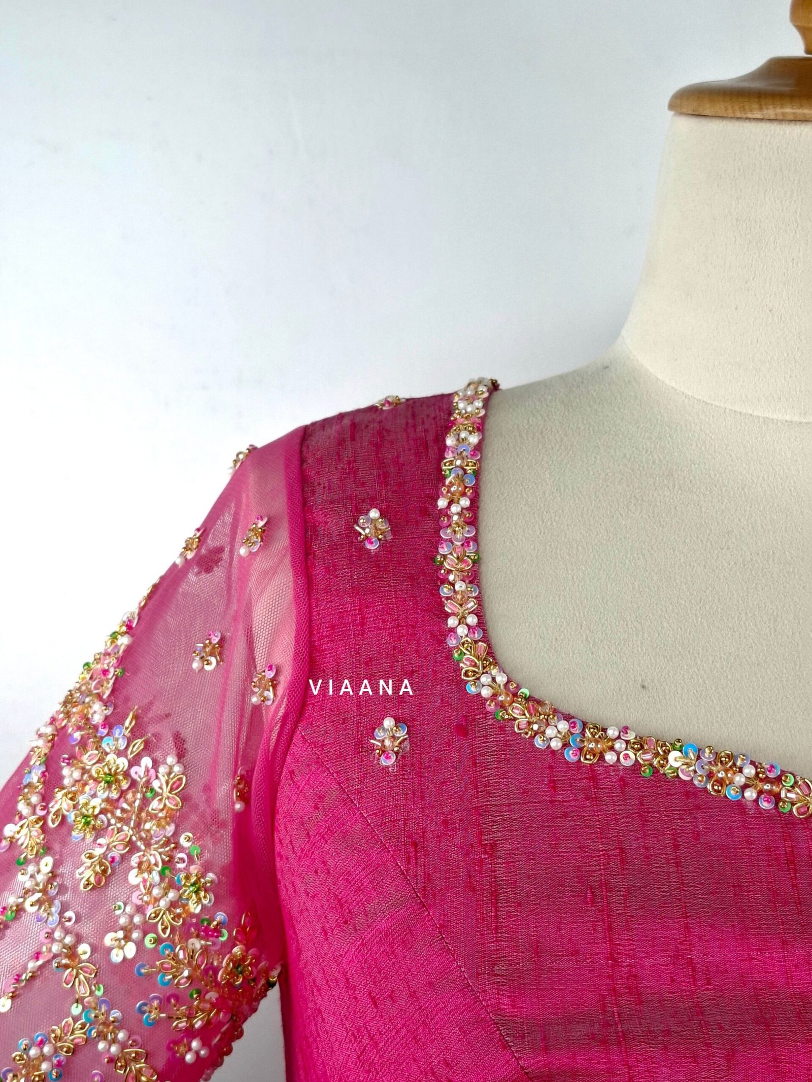 Minimal and elegant pastle sequins and Zardozi Embroidered blouse with net sleeves