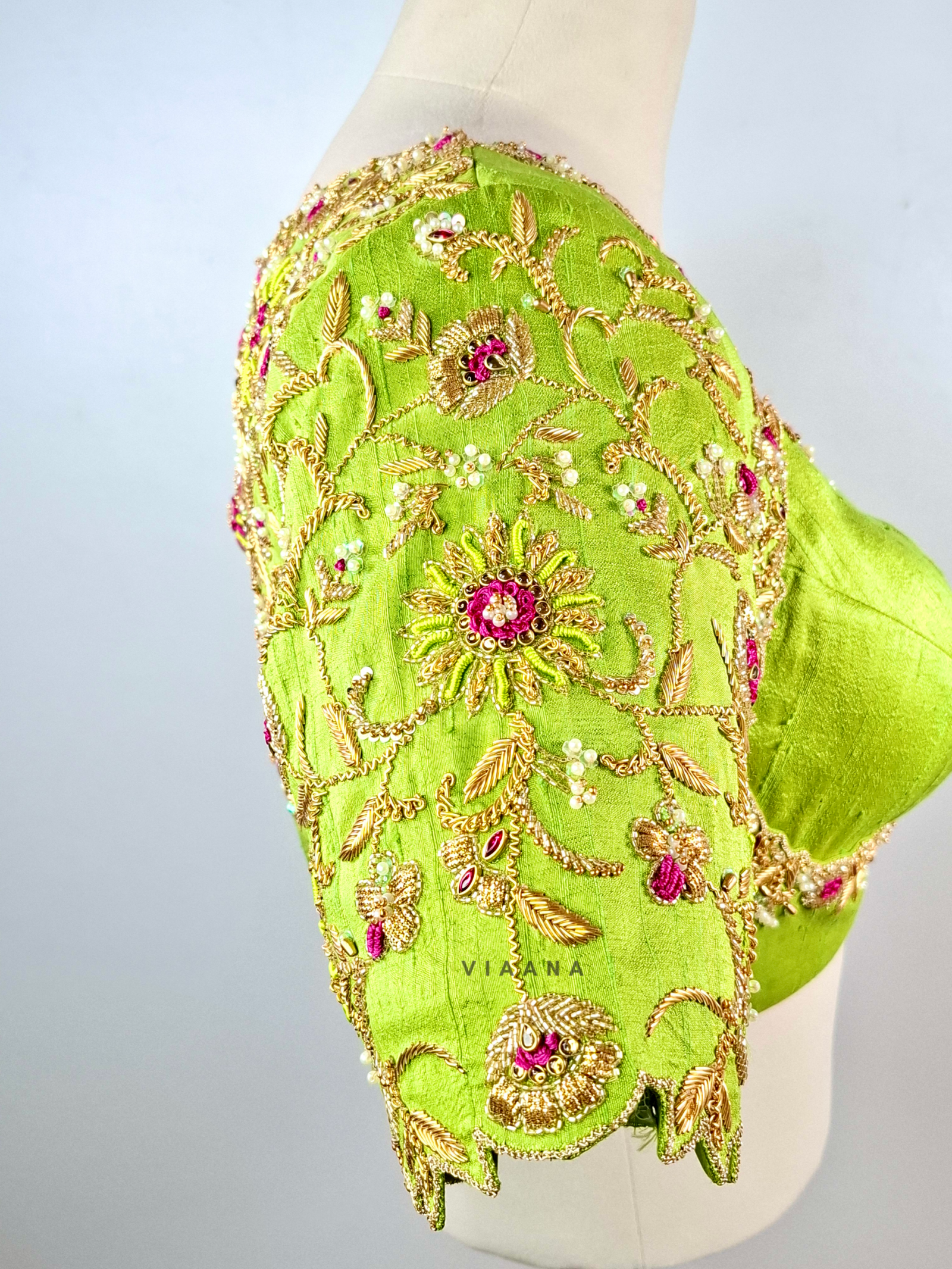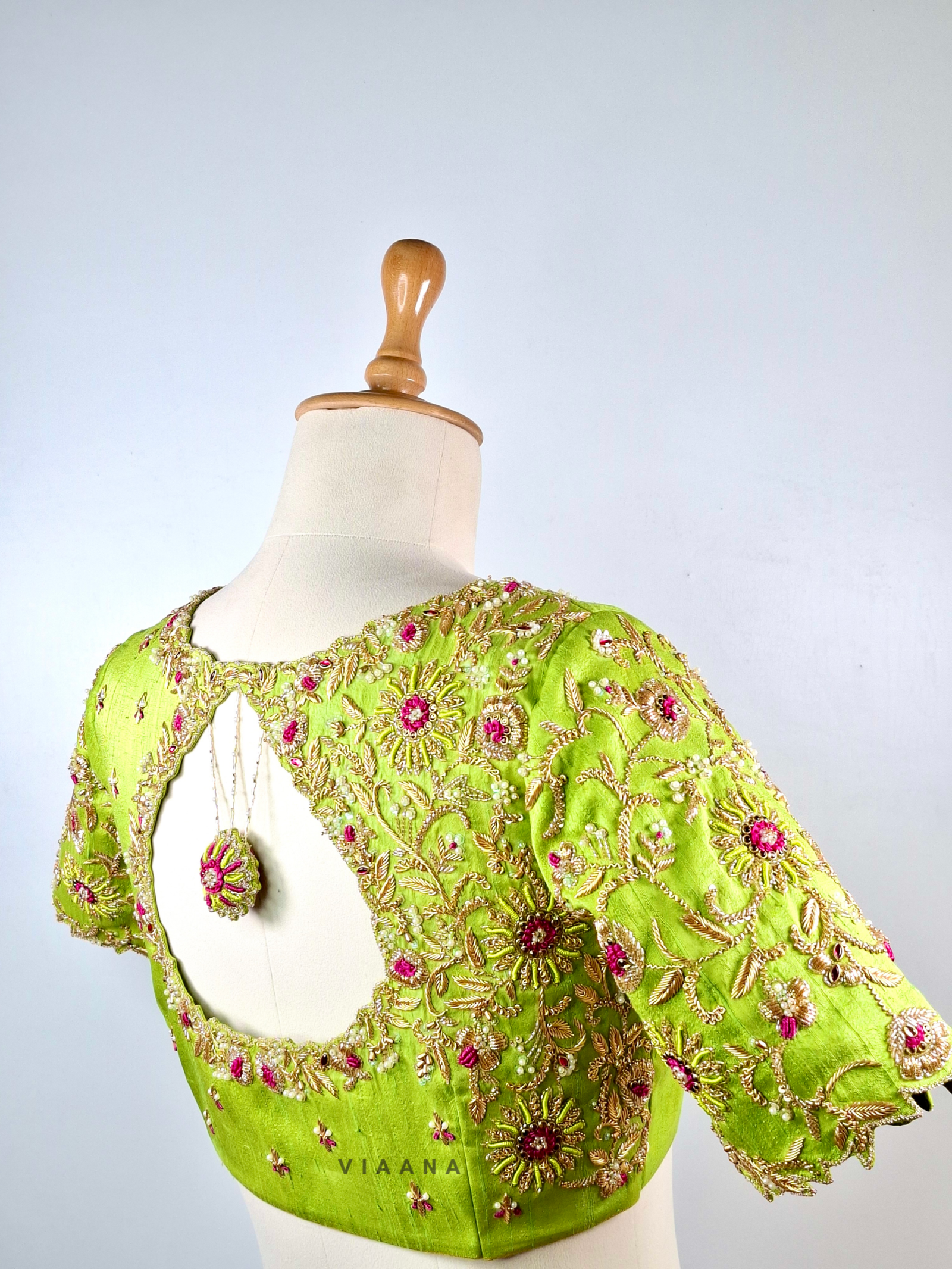 Stones, Zardozi and sequins floral embroided blouse with net and dangles on sleeves