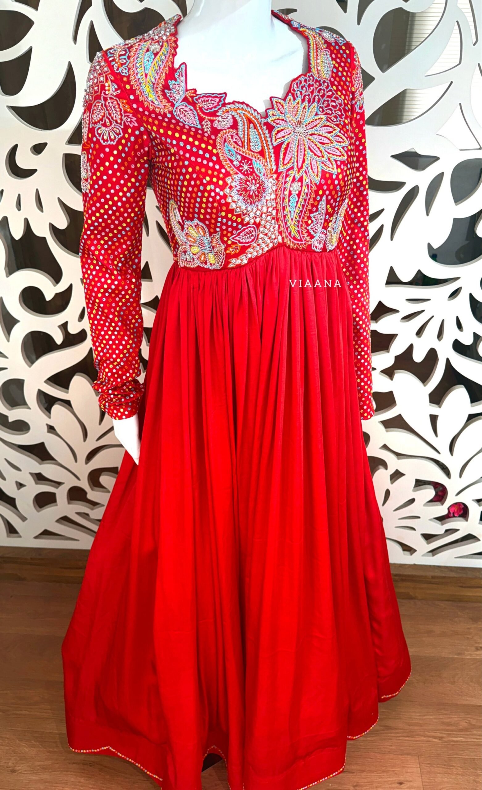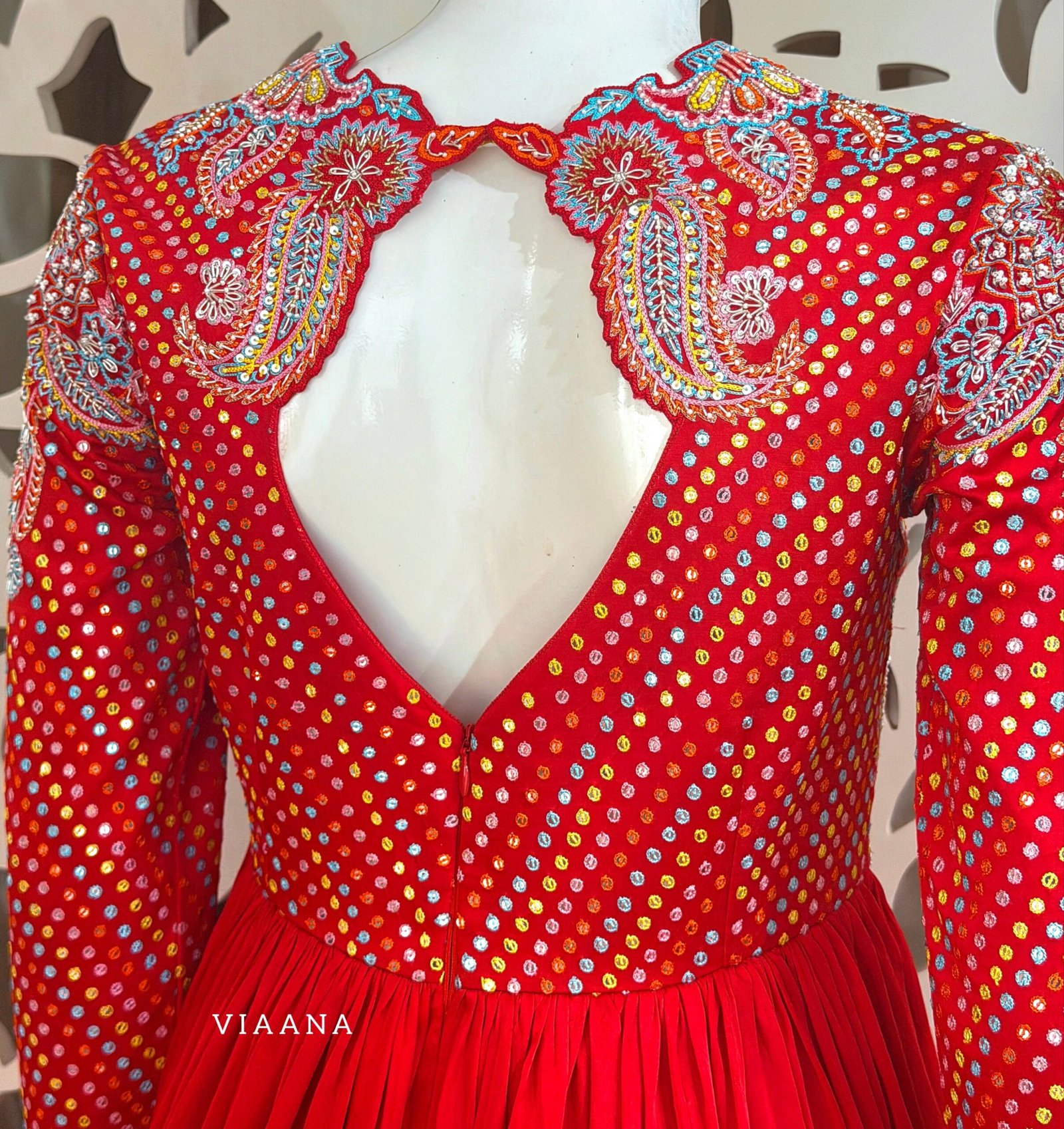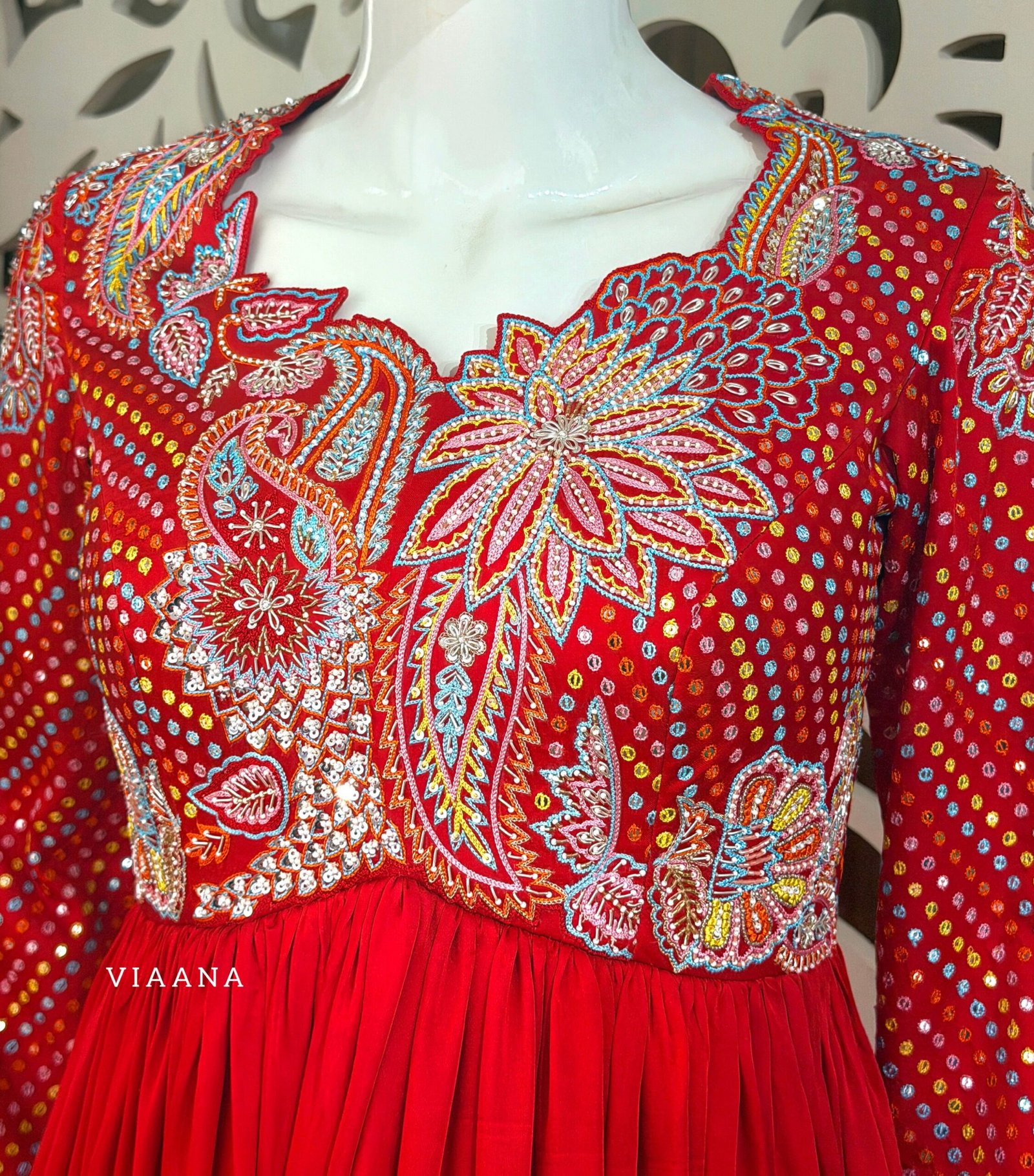 Multicolor floral and mango embroidery with sequins buttas, gathered gown with uneven cutwork