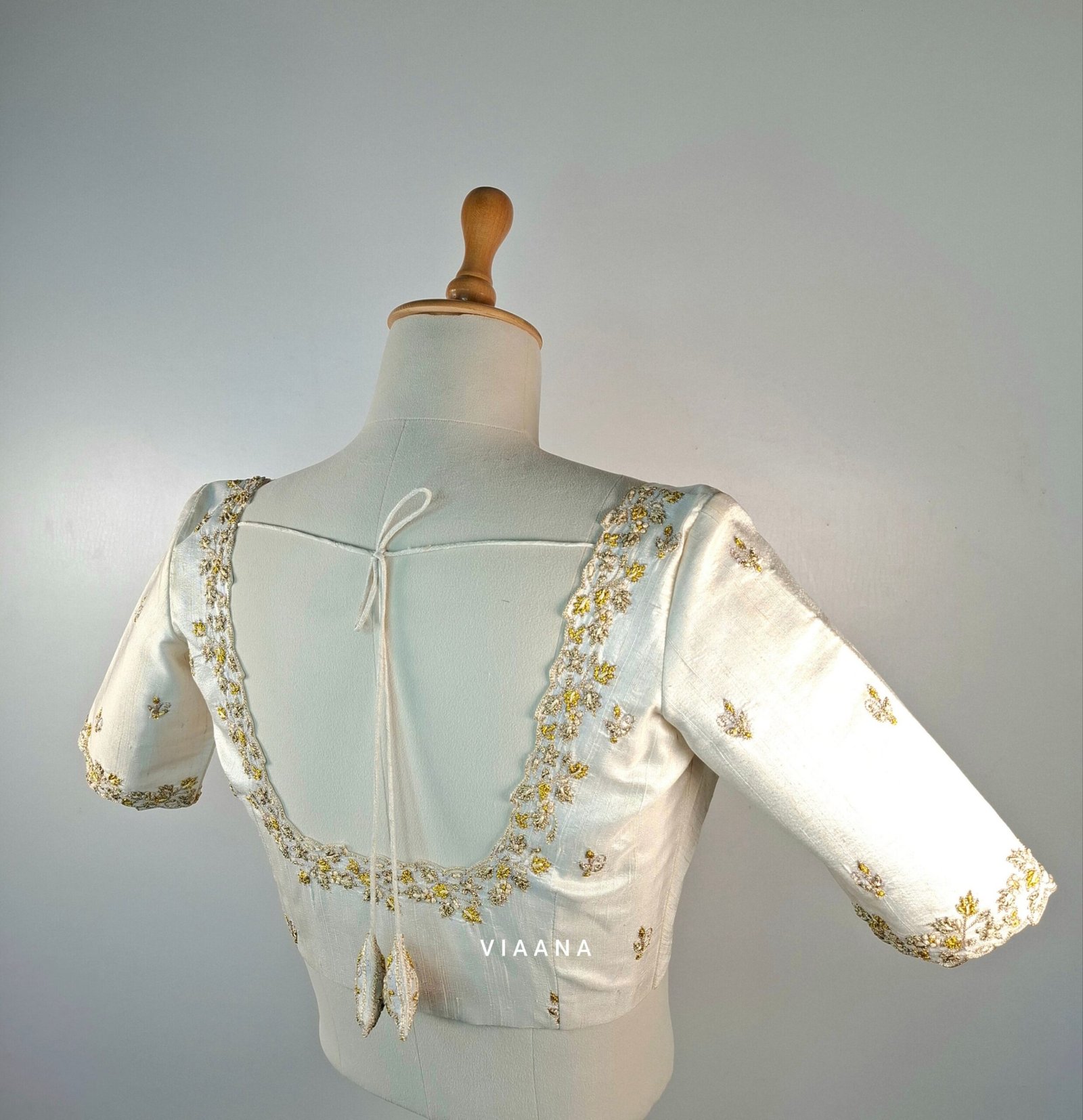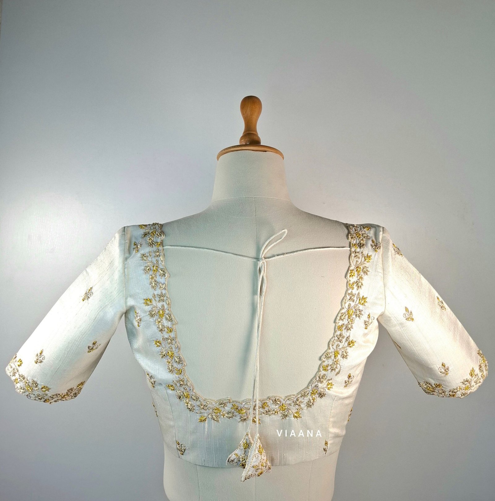 Bullion knot floral embroidery blouse with flower dangle on back