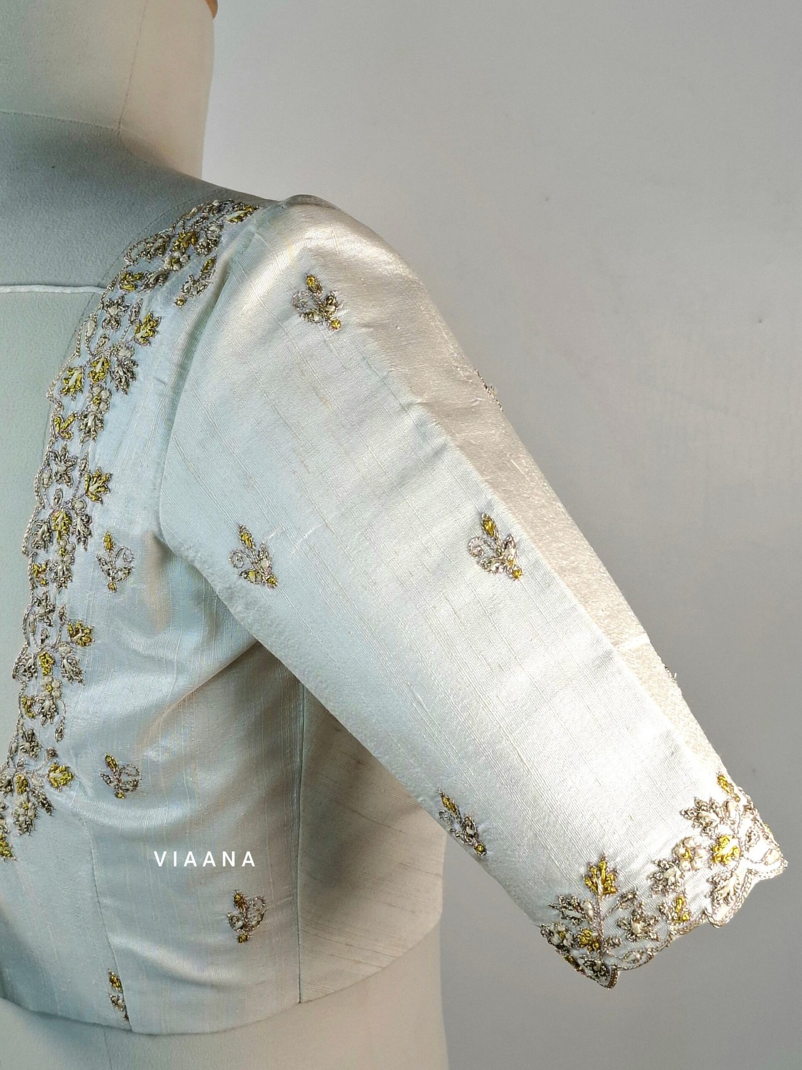 Elegant thread and zari knot embroidery with motifs on sleeves